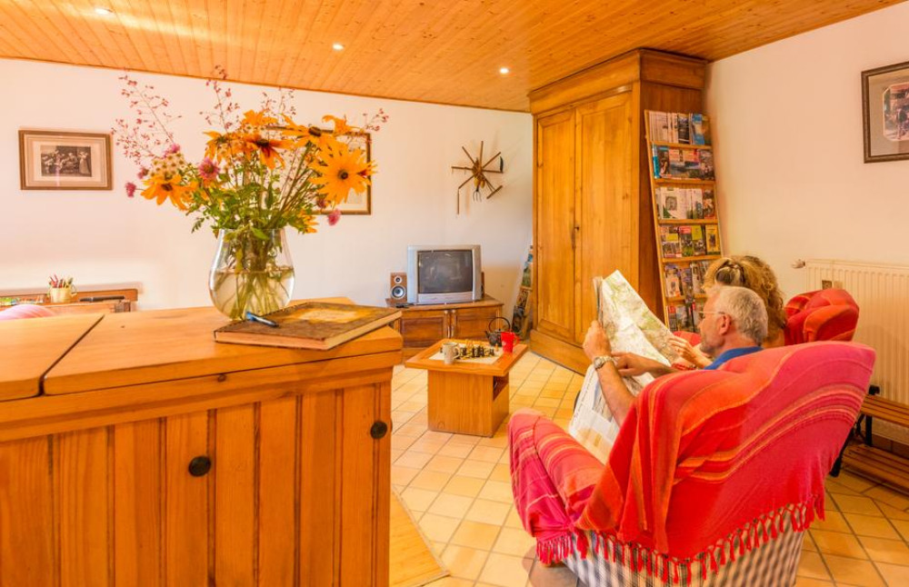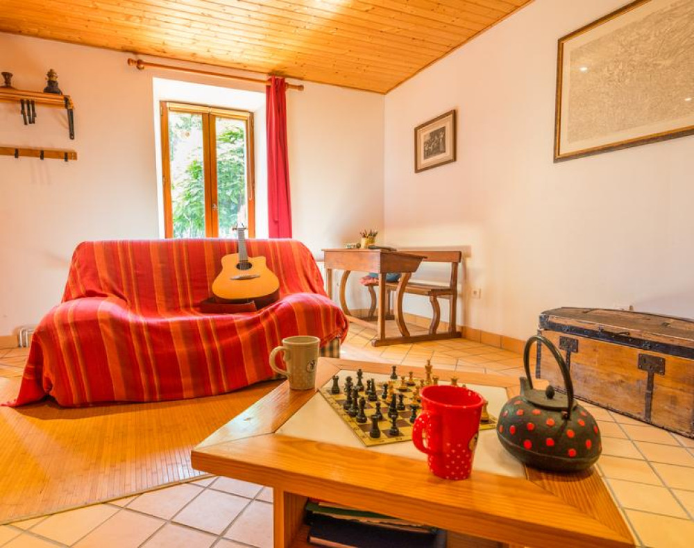 -On the ground floor, a large, bright living room, separated from the rest of the room by a bar, a dining room with a large farm table, and a large, fully-equipped kitchen area (cupboard, fridge/freezer, hob and extractor hood, electric oven, microwave, TV+DVD, stereo, internet access which may be unstable). You can also enjoy the Godin stove.