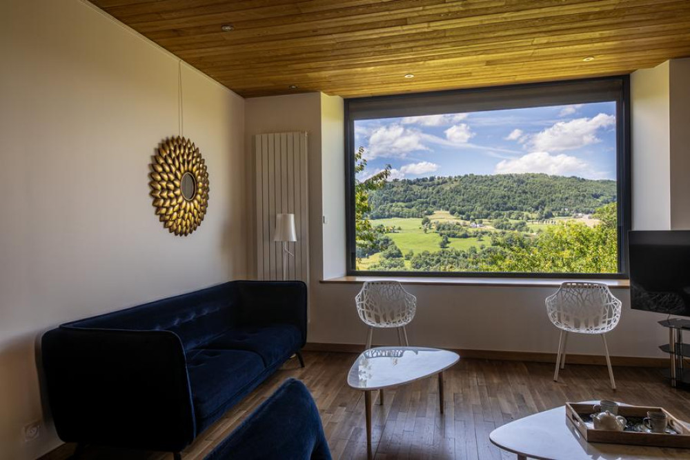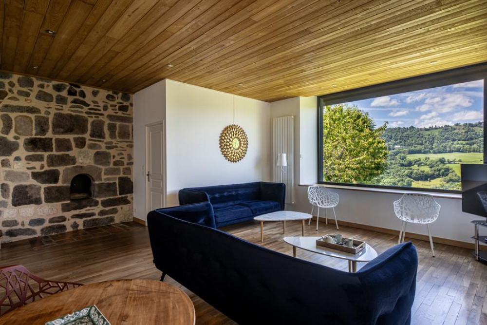For 4 to 6 people (4 adults, 2 children), it comprises a kitchen/dining room, a living room with a breathtaking view of the Cantal mountains and the Goul valley, two bedrooms with mezzanine, 2 bathrooms.