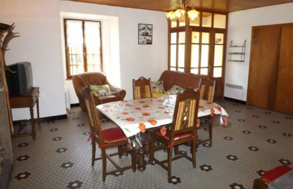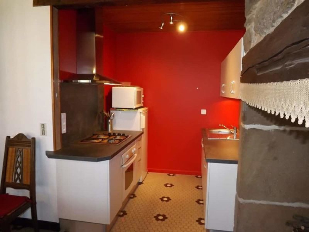 Séjour avec cheminée (poêle bois 35 €/m3) et accès internet wifi, coin-cuisine équipé, 1 chambre avec 1 lit 2 personnes, 1 chambre avec 1 lit 2 personnes et 1 lit 1 personne, salle d'eau, WC indépendant.