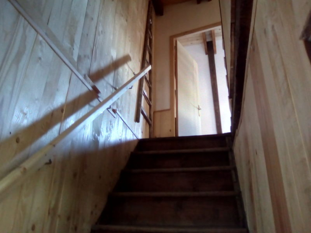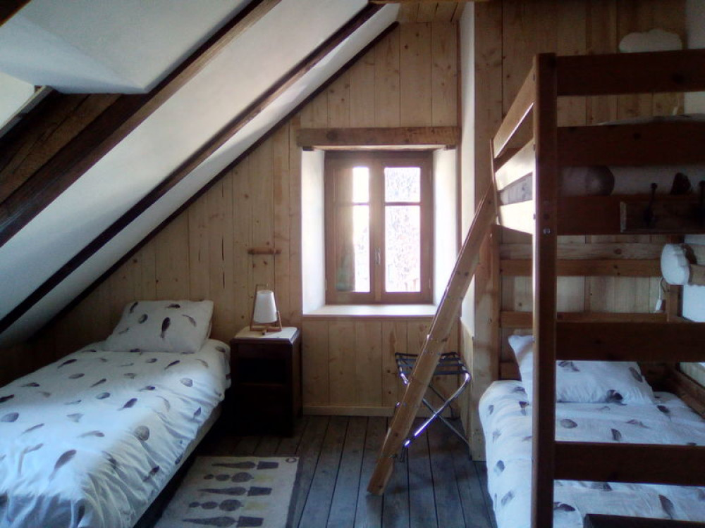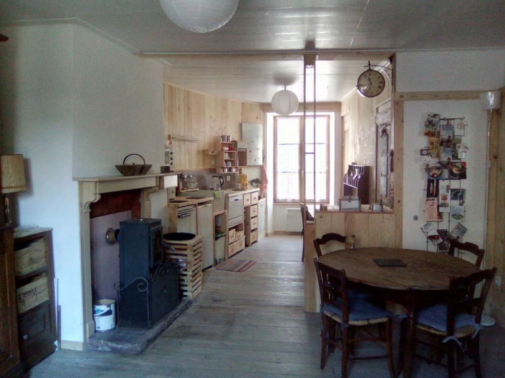 Canapé convertible deux places dans le séjour. Poêle à granulés.